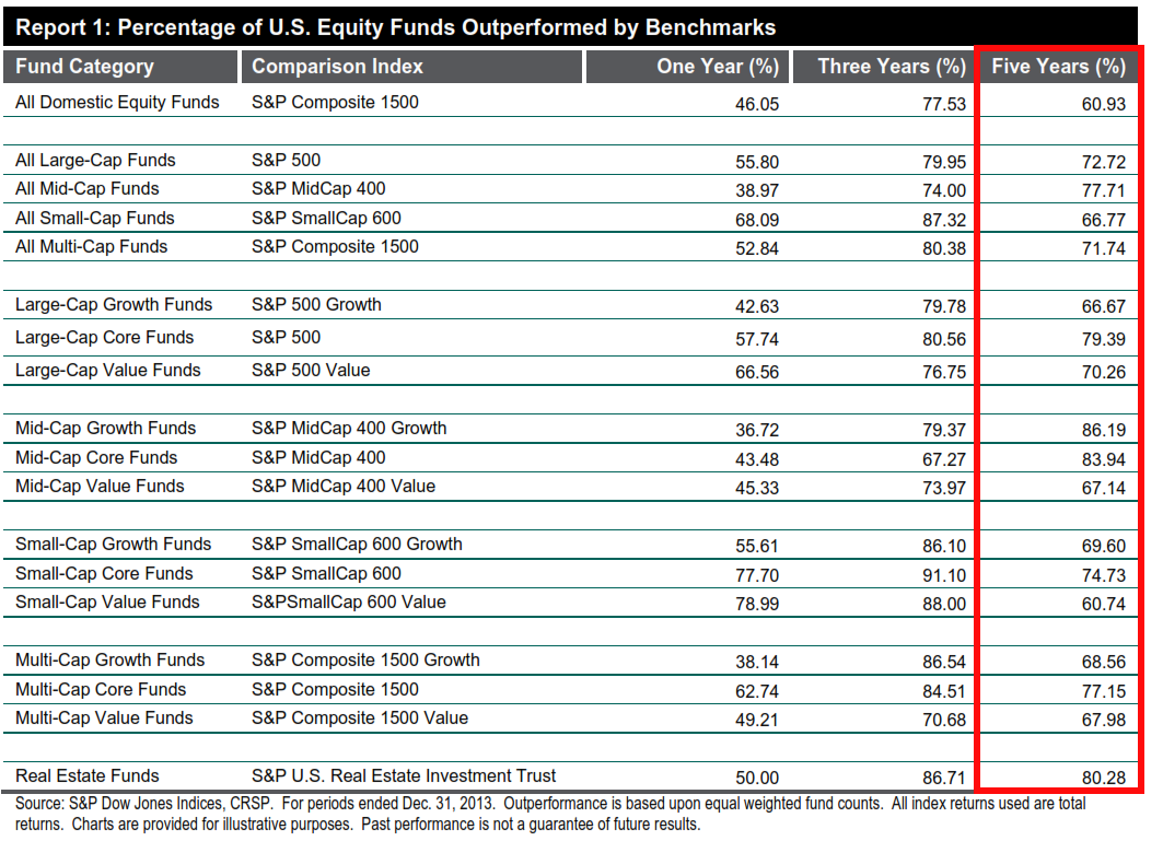 Standard & Poors just released their semi-annual review of actively managed mutual funds, taking a statistical look at how many managers are beating their respective benchmarks across multiple asset classes. The data show what we already know: most active managers under-performed over the last one, three and five years. Take a look at the far right column and see five-year results.
