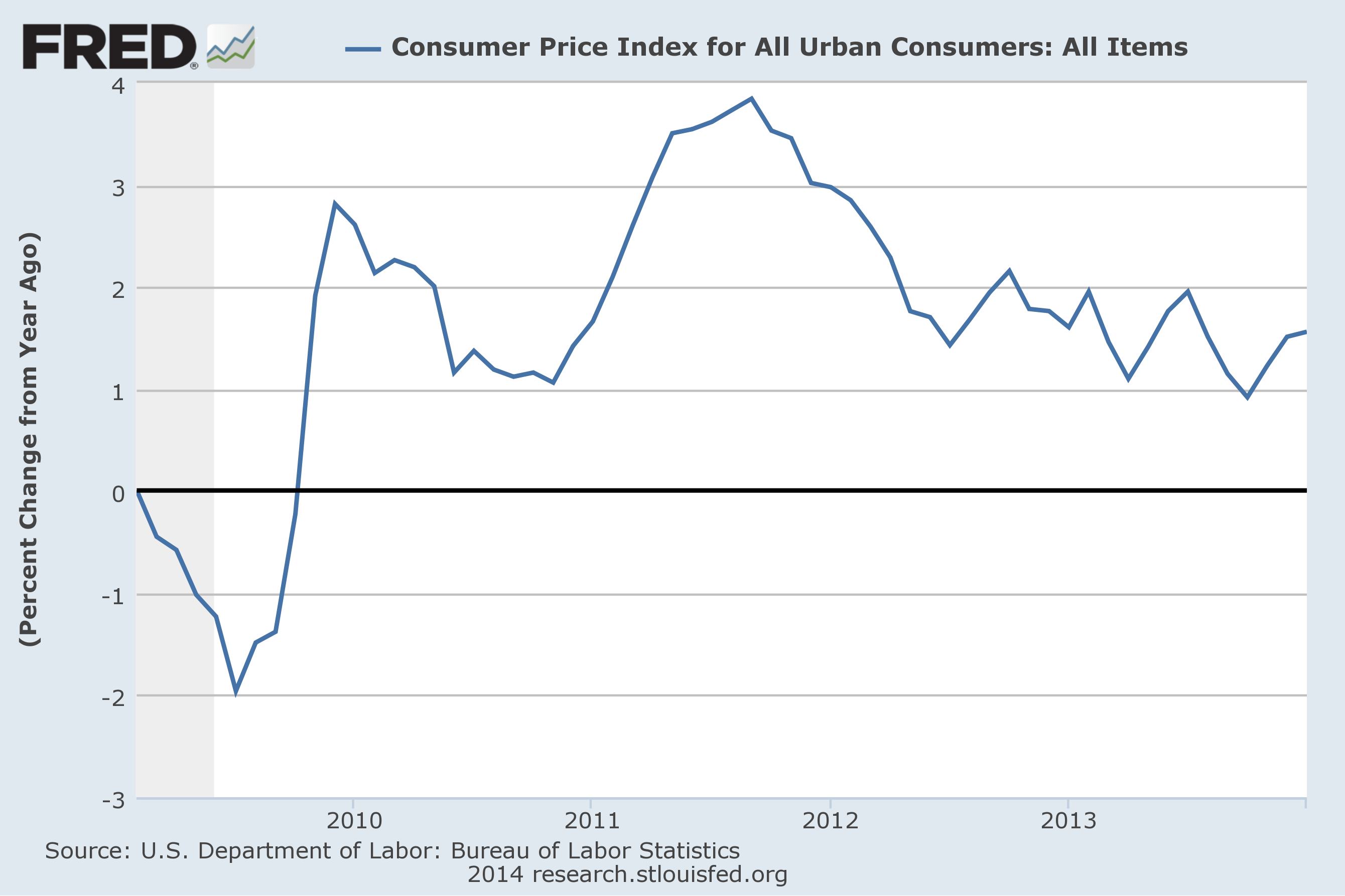 Yet despite increases in wages, inflation remains subdued. The US Consumer Price Index (which includes food and energy costs) has been stuck between 1% and 2% for nearly two years as the economy struggles to break out of a sluggish growth period.