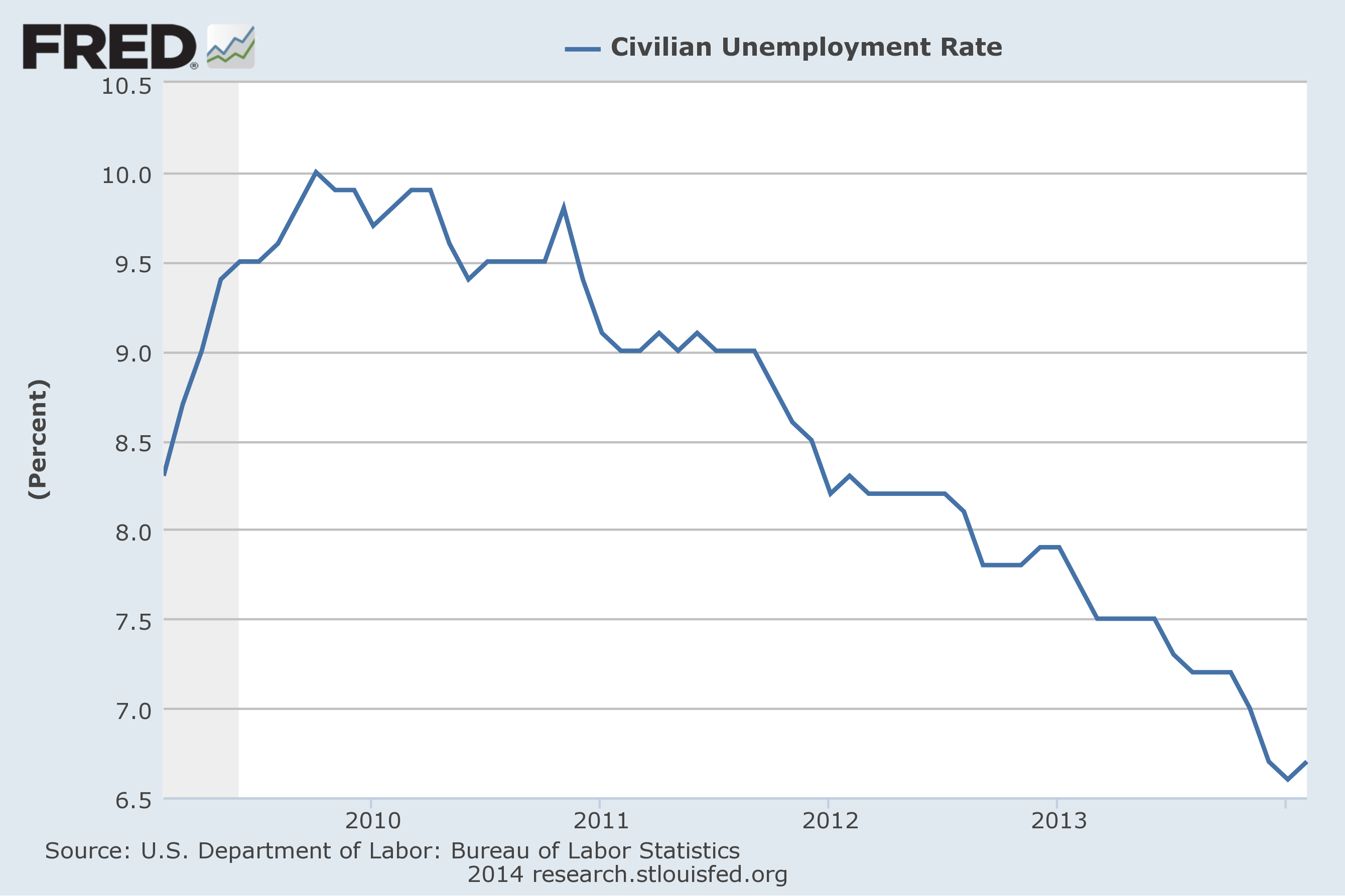 Despite a tick upwards in February that was largely weather-related, unemployment continued its devastatingly slow grind downward, currently at 6.7%.