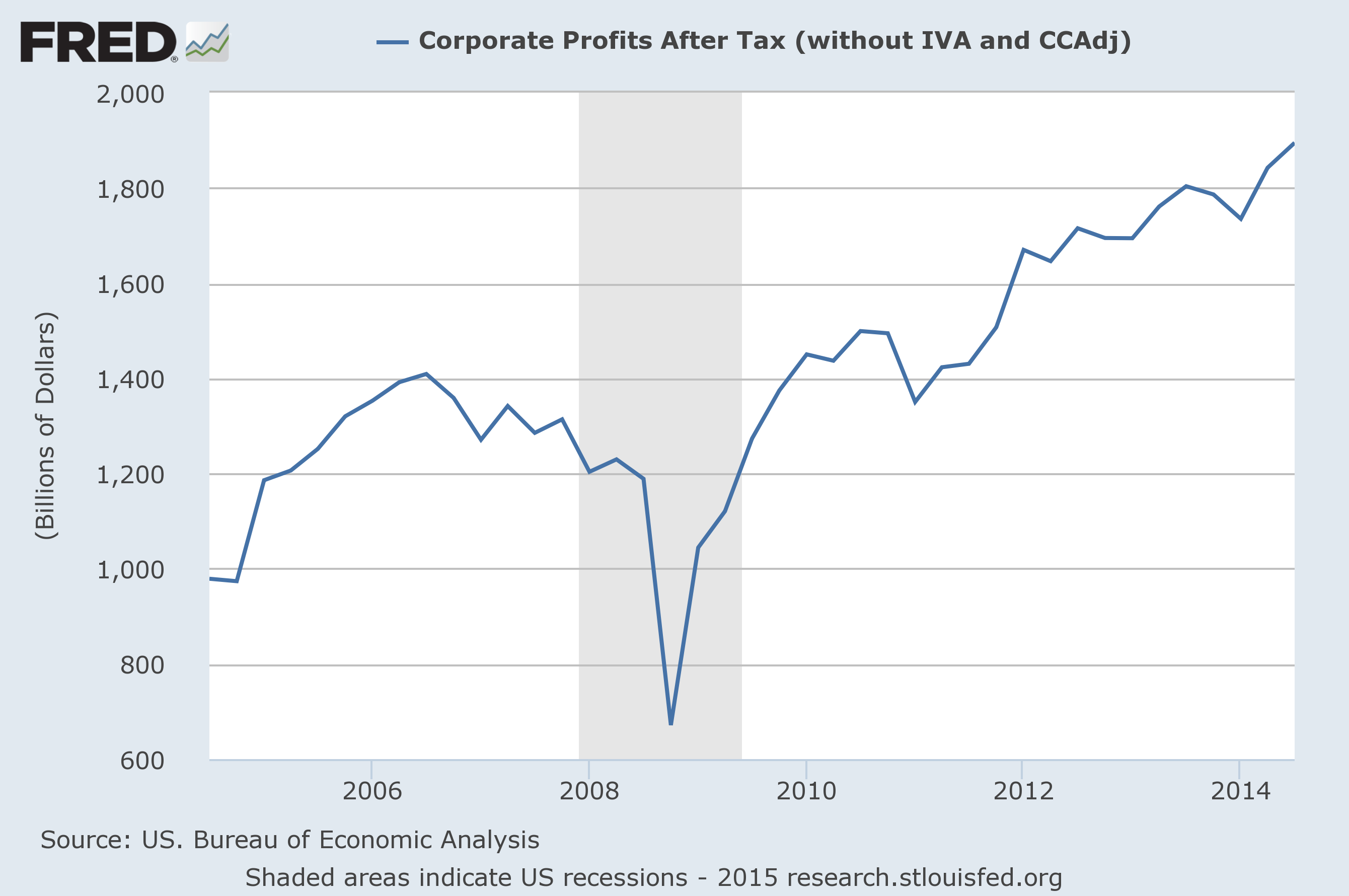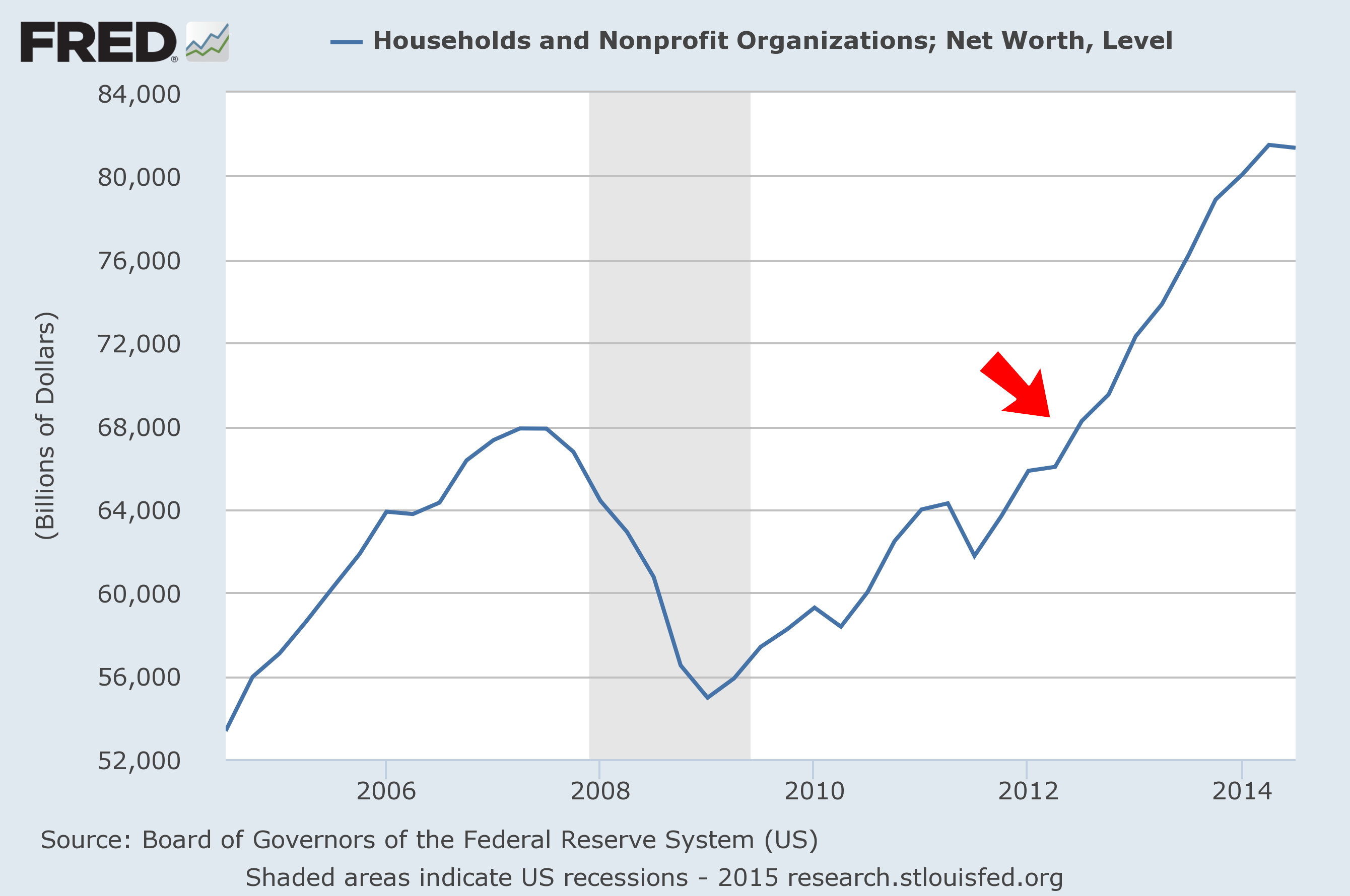 Consumer spending and business investment drive more corporate revenue growth. Some sectors are really taking off now. Unemployment has fallen nearly to pre-recession levels. Initial jobless claims reach a post-recession low. Now instead of “jobless recovery” headlines we see stories about how the average household hasn’t seen a raise in real terms in years.