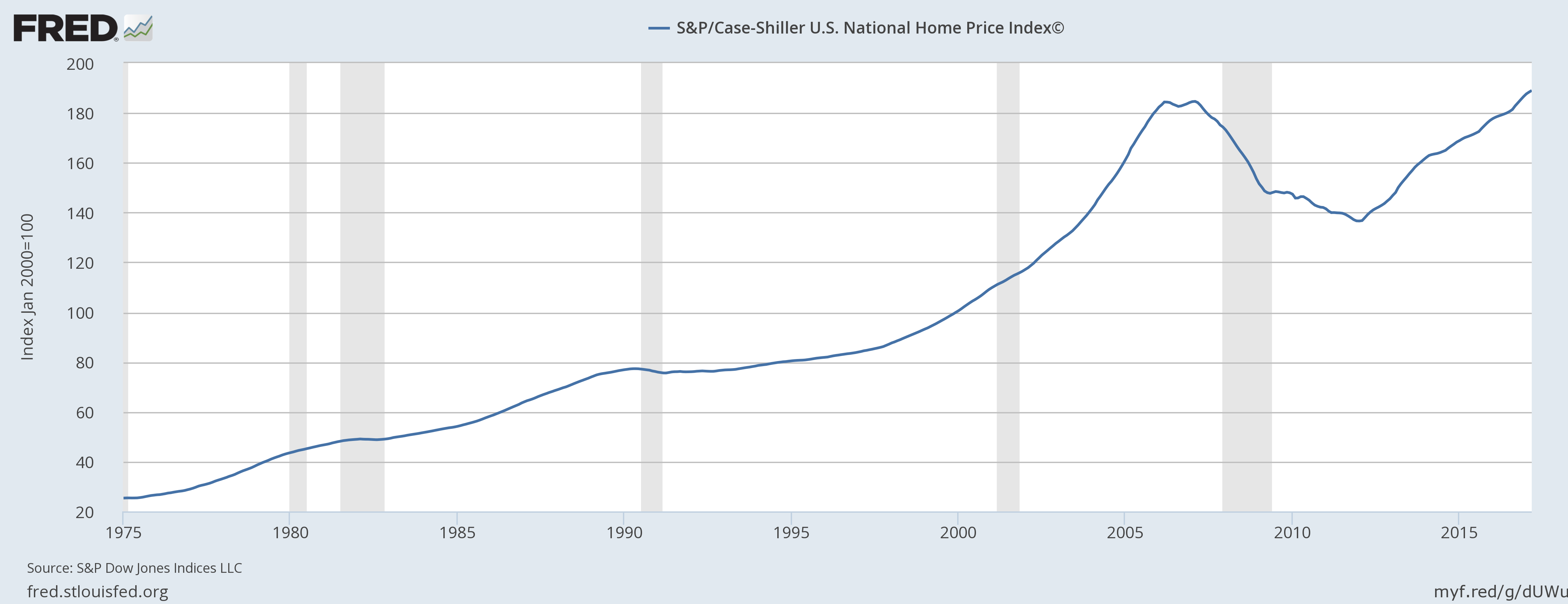 National home prices continue to move upwards. The S&P Case/Shiller National Home Price Index gained 5.5% year over year through April 2017. Current national average values are now above the 2007 peak.