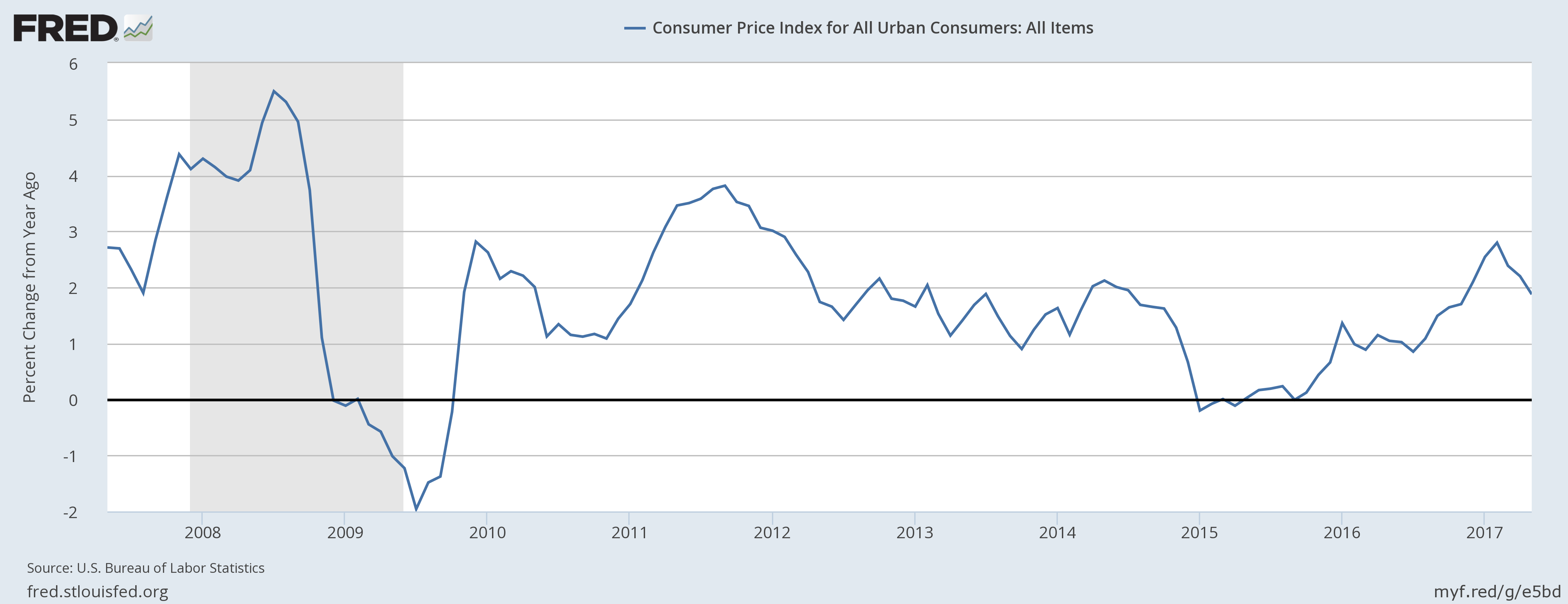 Inflation remains very low, with the seasonally adjusted Consumer Price Index coming in a just 1.87% year over year change in May, below the Fed’s 2% target for inflation.