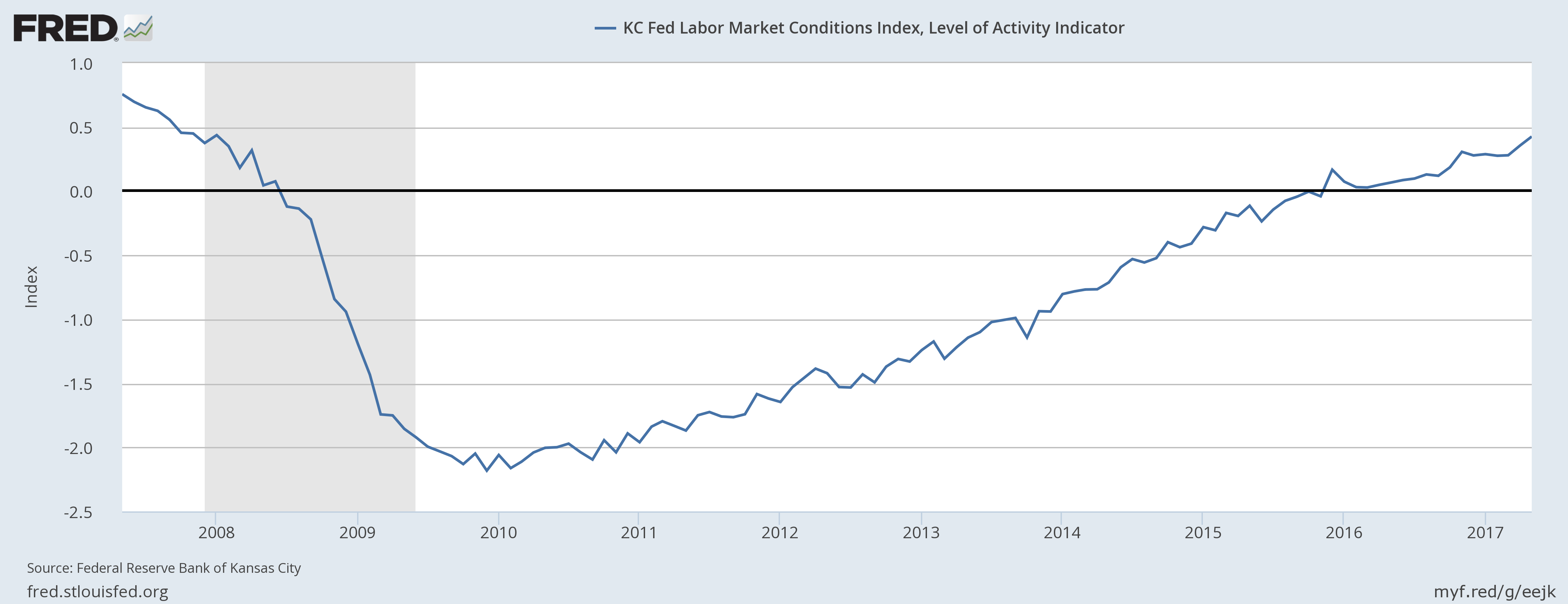 In line with the FOMC’s reasoning to raise rates, average hourly earnings of non-supervisory employees was modestly above inflation and the Fed’s 2% inflation target, with year-over-year increase through May of 2.42%. The Kansas City Fed’s Labor Market Conditions Index (LMCI) has shown a gradual increase in labor market conditions over the past several years, with a modestly positive position currently. The LMCI is an aggregation of data points on unemployment, wage, job quits, long-term unemployment, initial claims, labor force participation and several other inputs. It is a tool used to guide the Fed’s policy making.