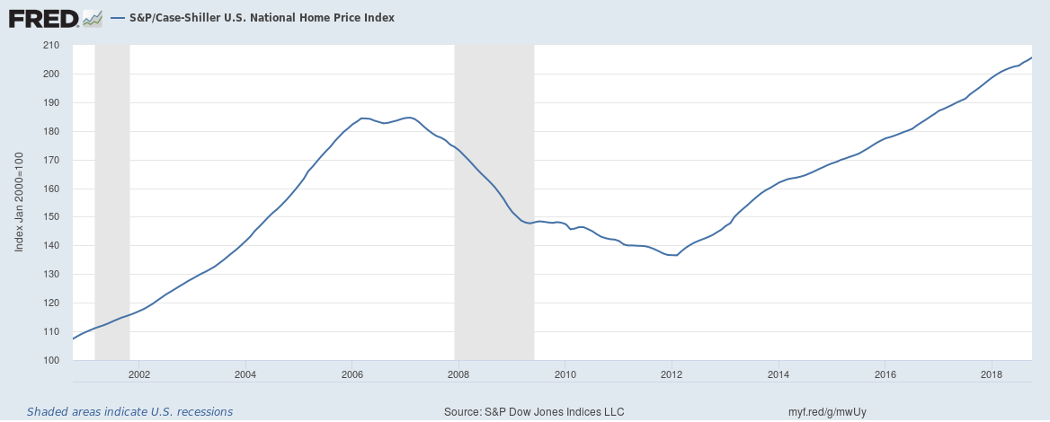 If anything in the US appears to show signs of softening, it is the residential real estate marketplace. After several years of catching up and a few areas with rapidly rising prices, the rate of price changes has slowed. Rising interest rates may also be contributing to weakening demand as mortgage payments increase proportionately. In October 2018 the Case Shiller national home price index gained 5.5% over the previous year, a more moderate figure than the last few years.