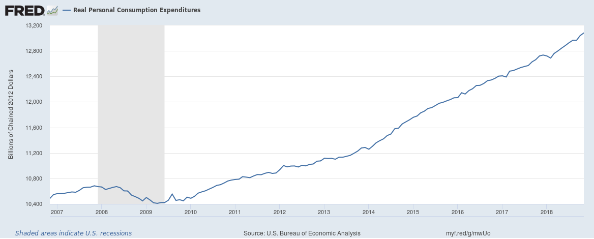 Consumer spending (that is, Real Personal Consumption Expenditures) gained 0.4% in November, just above the growth in real personal income (0.2%). You can see this number has steadily climbed after the downturn in the 2008 recession.
