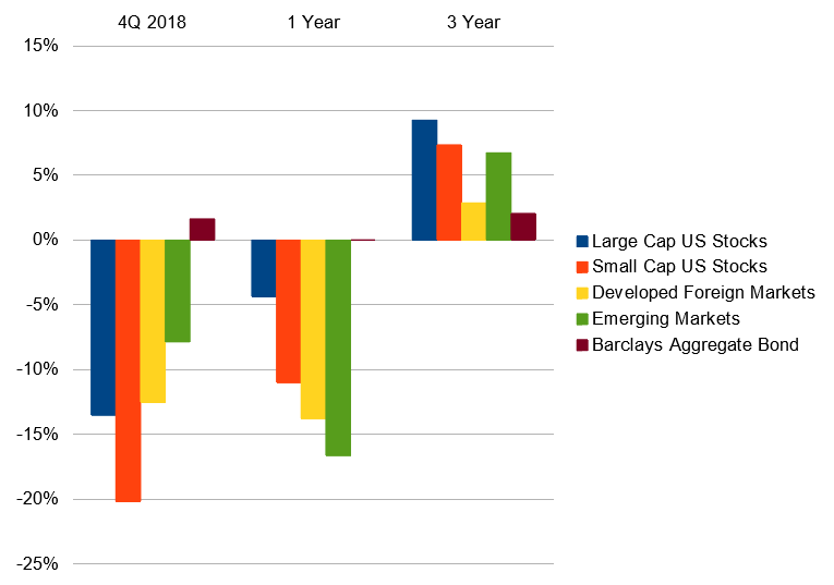 Most global stocks were down for the year, small (-11.01) to large, US (-4.38%) to International (-13.79%). Things that held up reasonably well earlier this year fell more heavily this quarter, led by small and large US stocks. Bonds held their own, with municipals posting modest gains for the year (1.28%) and broad US taxable bonds almost perfectly flat (0.01%).