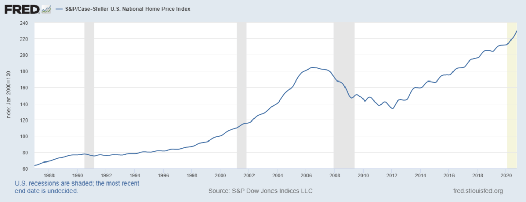Residential real estate prices continue to boom, buoyed by falling interest rates and limited housing stock. Pandemic shutdowns caused a fall in new home construction and sales, and we all know the feeling (and some the personal experience) of looking for a new home to be locked down in. In October the Case-Shiller National Home Price Index had gained 8.4% over the previous twelve months, again reaching all time highs. Looking only at this data, you could never know the economic turmoil we experienced in 2020.