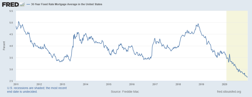 Mortgage rates are at historic lows, spurring incredible refinance activity and boosting home prices as we saw above. National average rates for a 30-year loan touched 2.66% late in 2020 (and here I thought my 15-year, 2.875% mortgage was a steal in September!).