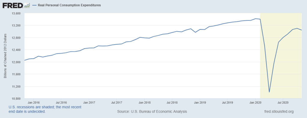 Personal spending has rebounded from the bottom but with a resurgence in COVID-19 cases late this fall, has dropped back off again. Real Personal Consumption Expenditures are well below early 2020 levels as consumers have limited opportunities and many Americans have limited means for personal spending.