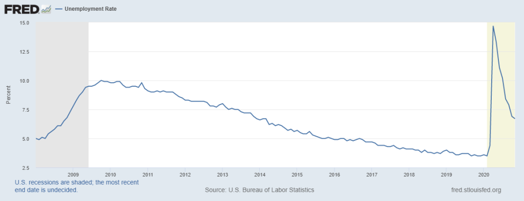 Since the spring, we have been slowly clawing our way back to some sense of normalcy, with a long way to go still. Initial unemployment claims are falling slowly but are still above any level seen in the 2008-2009 recession. Unemployment is falling as many of the jobs lost in the spring came back much more quickly than a typical recession.