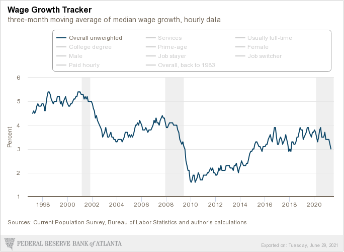 Wage growth has been very steady in the 3-4% range for the last 12 months. Monthly growth has surprised to the upside, at 0.5% in May alone for all private market nonfarm payrolls.
