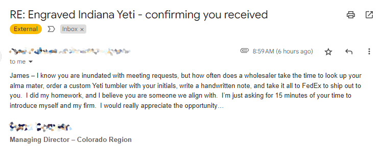 Immediately, the phone calls and emails started. Did you get our mug, did you see it, can we get a meeting. Over and over and over again. The emails and voicemails get deleted. (No, I don’t answer the phone when I don’t recognize a client calling). What is incredible in all of this is the sense of entitlement this wholesaler had. That there is some sort of quid pro quo here: I sent you a trinket, now you have to listen to my pitch. Here’s the last email: