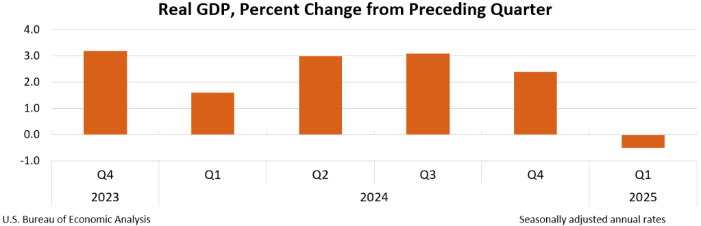 A revised GDP calculation showed that the US economy shrank -0.5% during the first quarter of 2025. Per the BEA, this was a result of increased imports and overall decreased domestic consumer spending. Current estimates for real-time second quarter figures range from 2.5% (Bank of America) to 3.9% (Goldman Sachs) and the Atlanta Fed’s GDPNow tracker shows 2.9% (all of these figures have been recently adjusted downwards).
